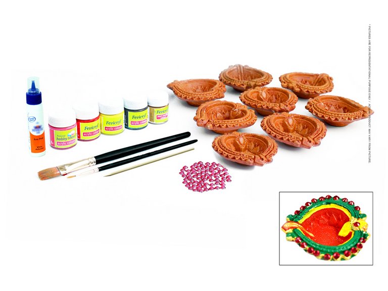 (8 Diyas / 5 acrylic colors / 2 brushes / Embellishments / Glue / Tool stick.)