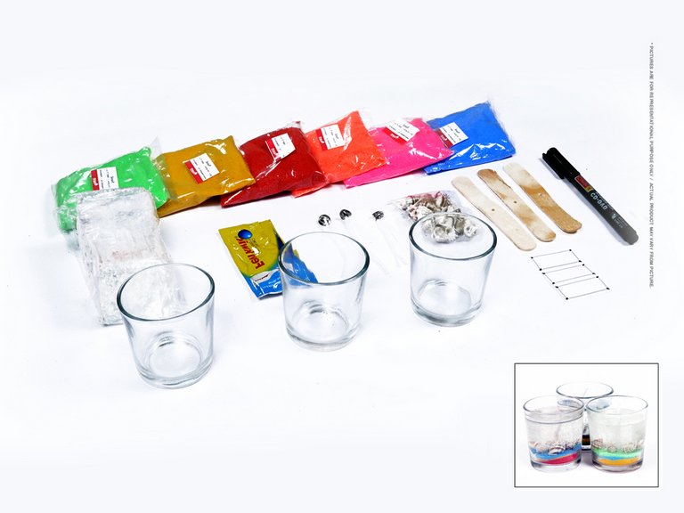 3 Glasses / Sand in 6 colours / Gel-200 grams / 3 Wicks / Shells / Glue / Stickers / Marker)
